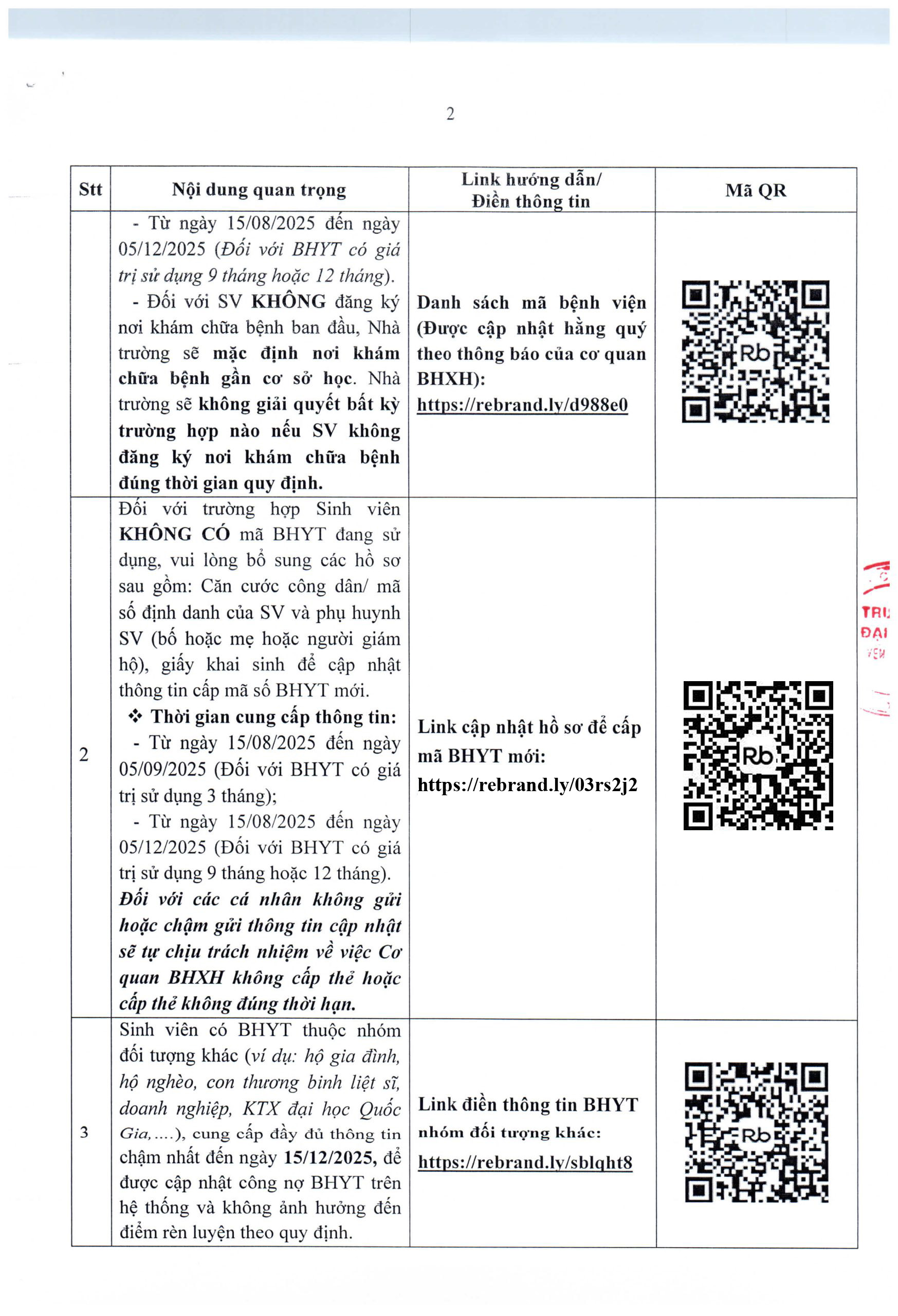 Nhà trường thông báo v/v tham gia BHYT bắt buộc và bảo hiểm tai nạn (BHTN) đối với SV trong năm học 2025-2026 (Đợt 1) với nội dung như sau: