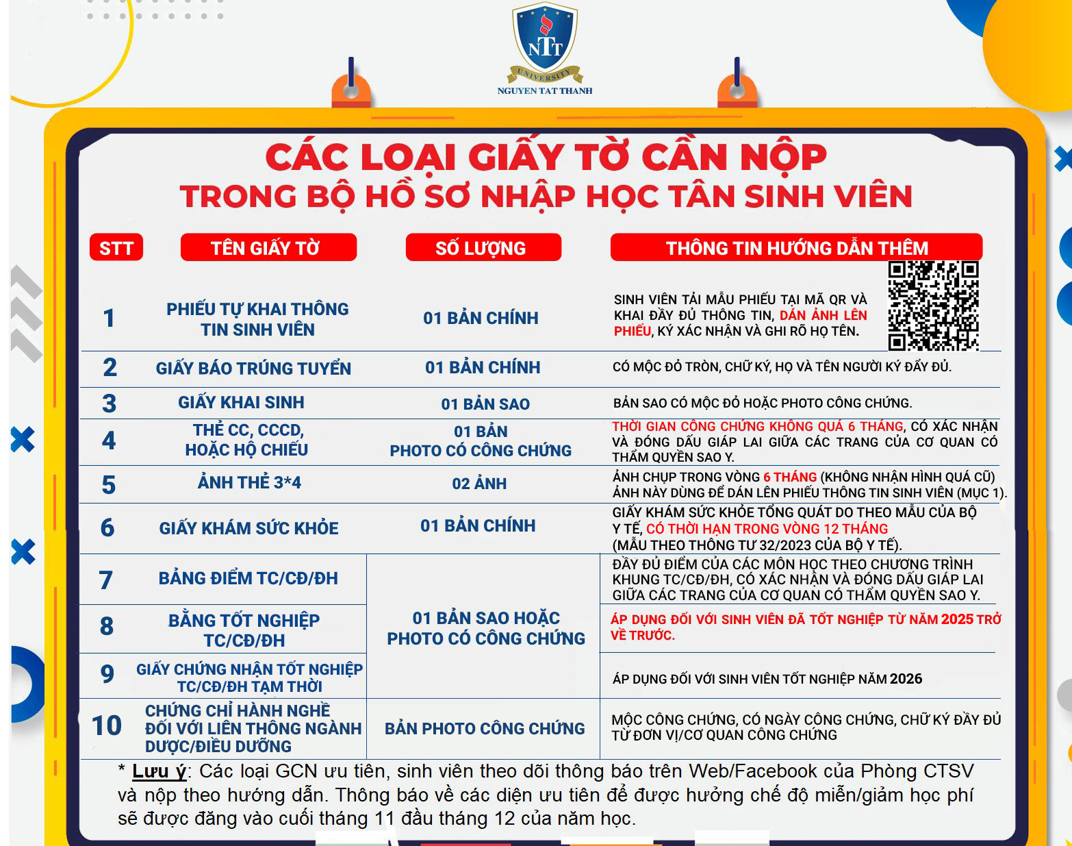 | 6 | Giấy chứng nhận ưu tiên (nếu có) | 01 bộ theo thông báo hướng dẫn | Sinh viên theo dõi thông báo của Phòng Công tác sinh viên và nộp theo hướng dẫn. |