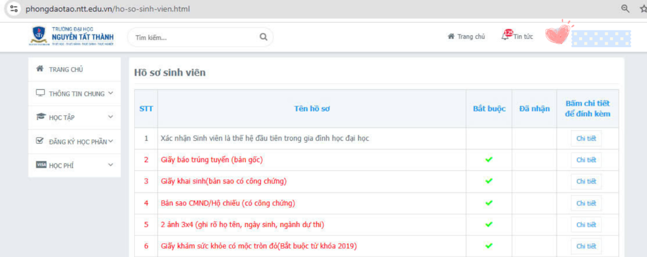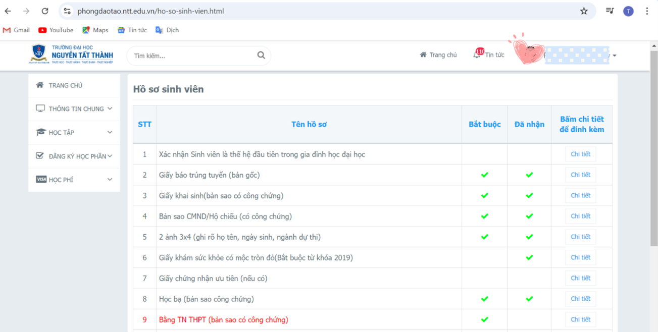 - Sinh viên kiểm tra các hồ sơ đã được cập nhật trên hệ thống (cột đã nhận).