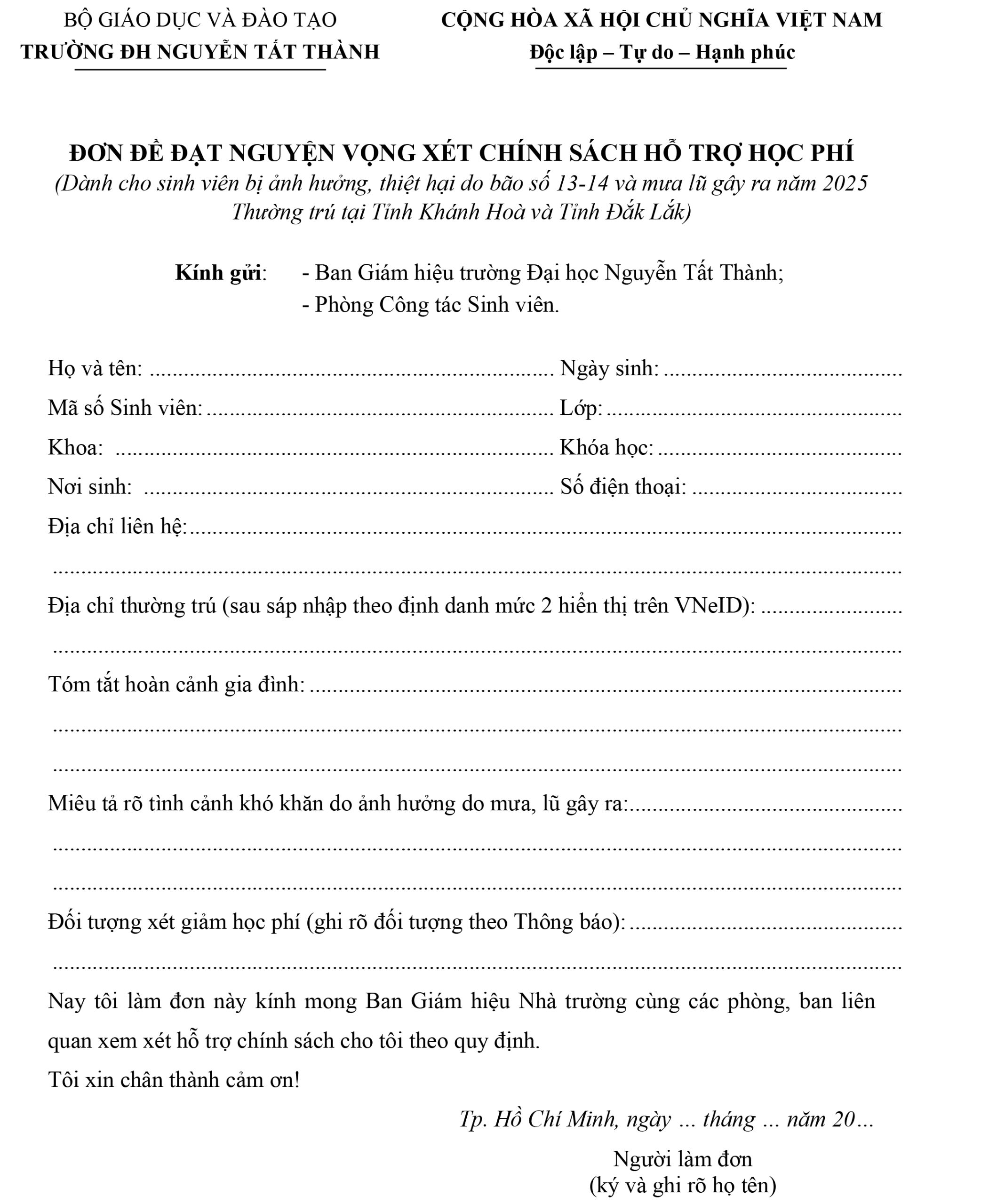 Trường Đại học Nguyễn Tất Thành thông báo về chính sách hỗ trợ học phí đối với sinh viên thường trú tại tỉnh Khánh Hòa và tỉnh Đắk Lắk bị ảnh hưởng bởi bão số 13–14 và mưa lũ năm 2025.