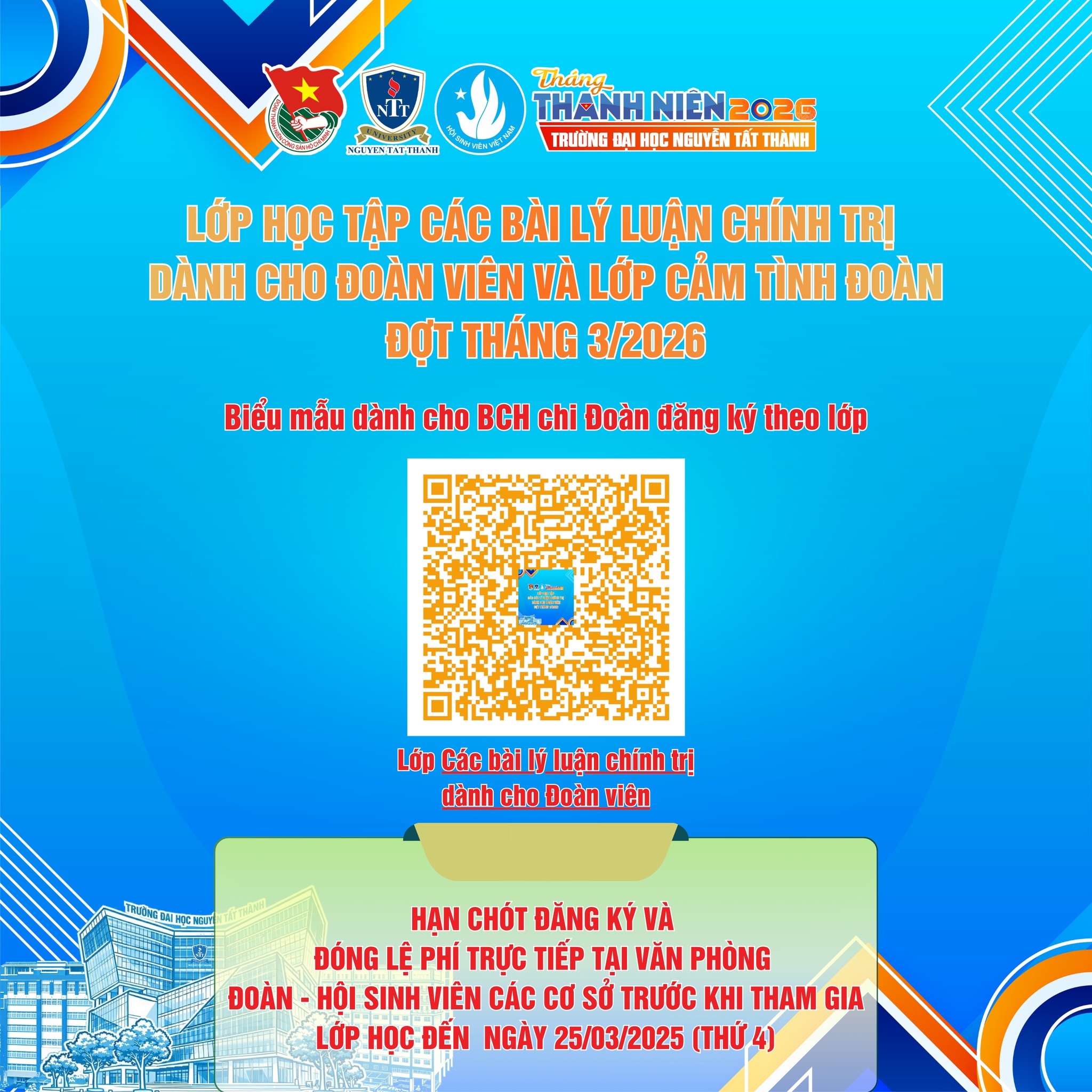 Hòa trong không khí sôi nổi tuổi trẻ cả nước hướng đến chào mừng kỷ niệm 95 năm ngày thành lập Đoàn TNCS Hồ Chí Minh (26/03/1931 – 26/03/2026), hướng đến kỷ niệm 51 năm ngày Giải phóng miền Nam thống nhất đất nước (30/4/1975 – 30/4/2026). Văn phòng Đoàn – Hội Sinh viên trường Đại học Nguyễn Tất Thành xin thông tin đến Đoàn viên, Sinh viên NTTU lớp Các bài lý luận chính trị đợt tháng 3 – 2026 như sau: