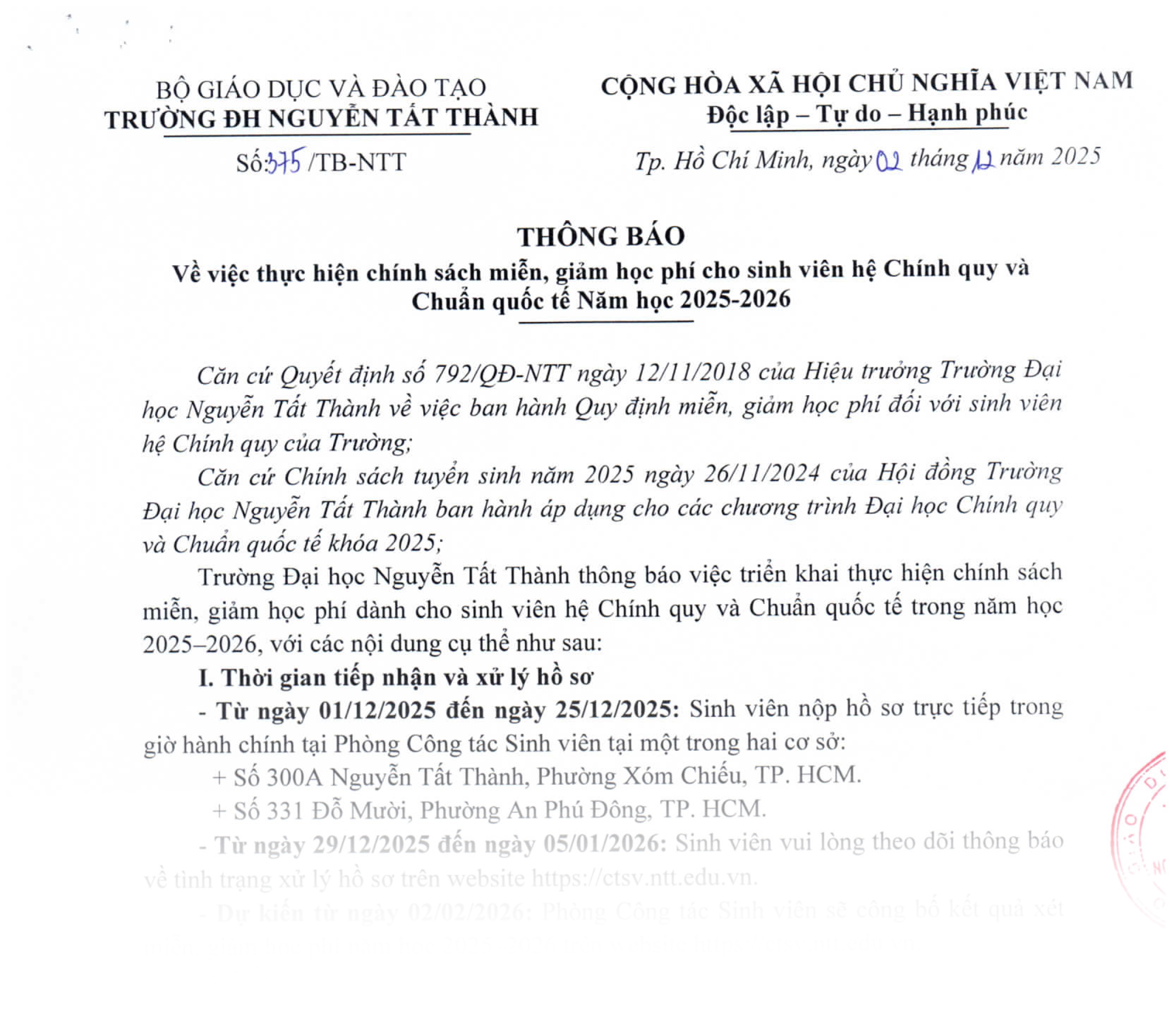 Trường Đại học Nguyễn Tất Thành Về việc thực hiện chính sách miễn, giảm học phí cho sinh viên hệ Chính quy và Chuẩn quốc tế Năm học 2025-2026.