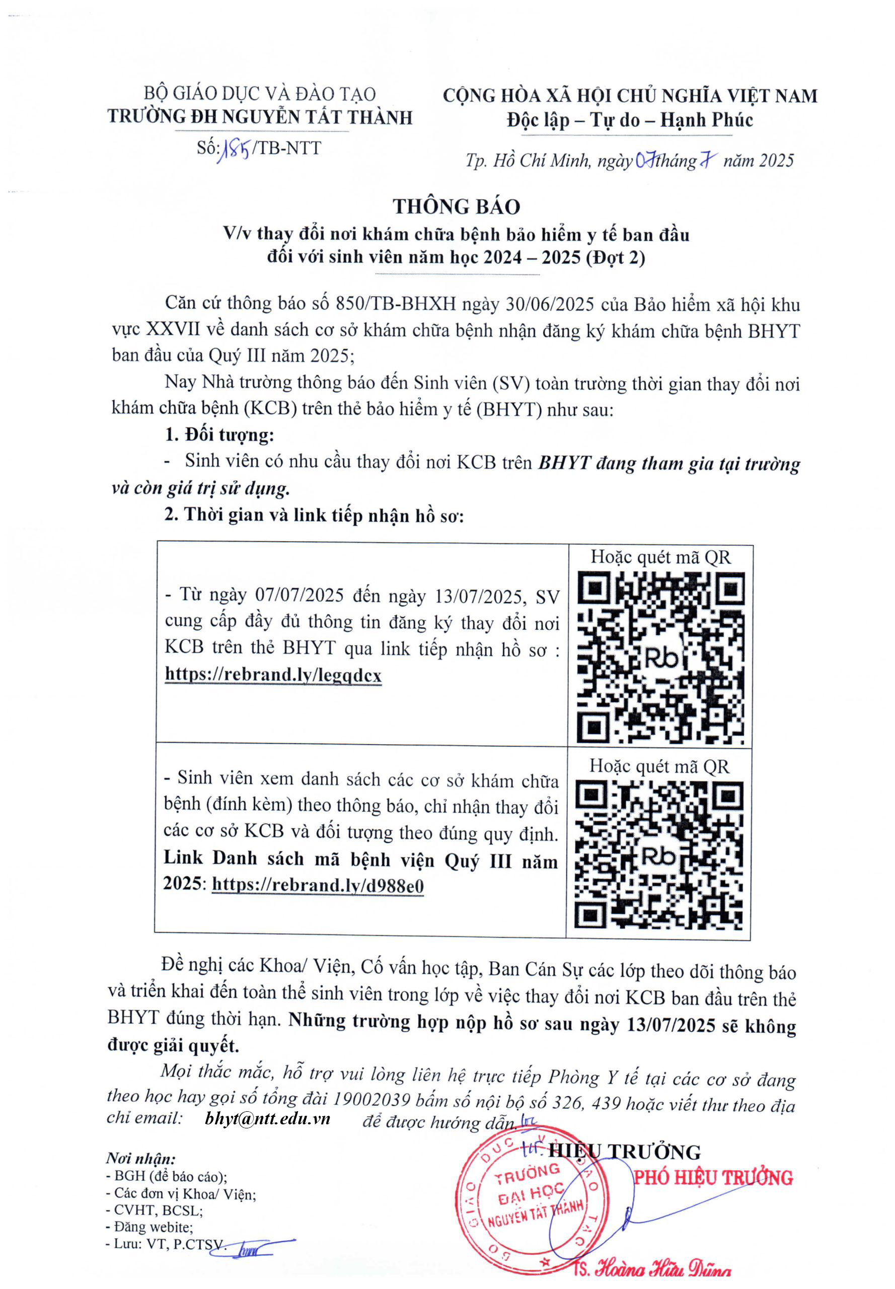 Nhà trường thông báo đến Sinh viên (SV) toàn trường thời gian thay đổi nơi khám chữa bệnh (KCB) trên thẻ bảo hiểm y tế (BHYT) như sau: