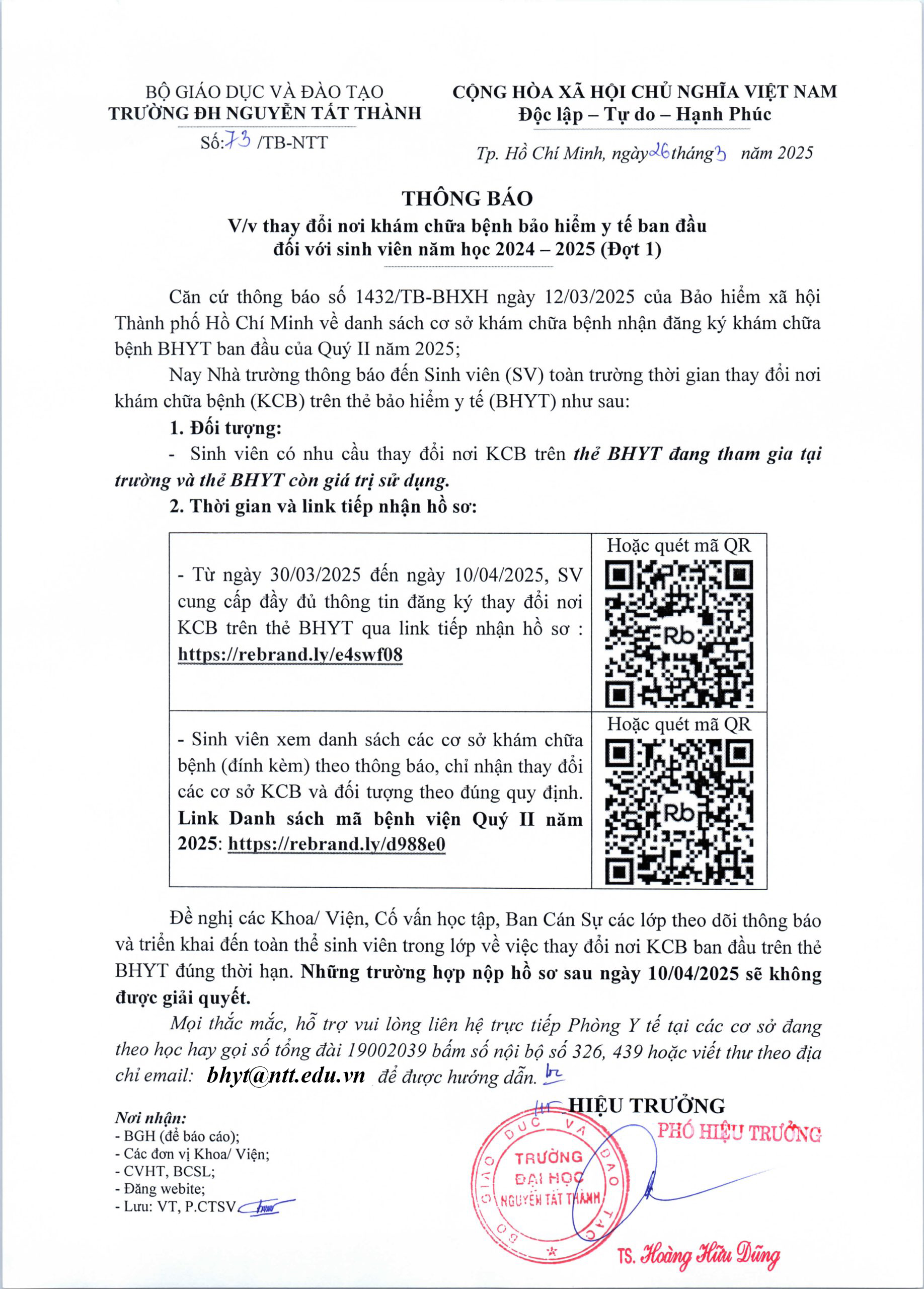Từ ngày 30/03/2025 đến ngày 10/04/2025, SV cung cấp đầy đủ thông tin đăng ký thay đổi nơi KCB trên thẻ BHYT qua link tiếp nhận hồ sơ : https://rebrand.ly/e4swf08