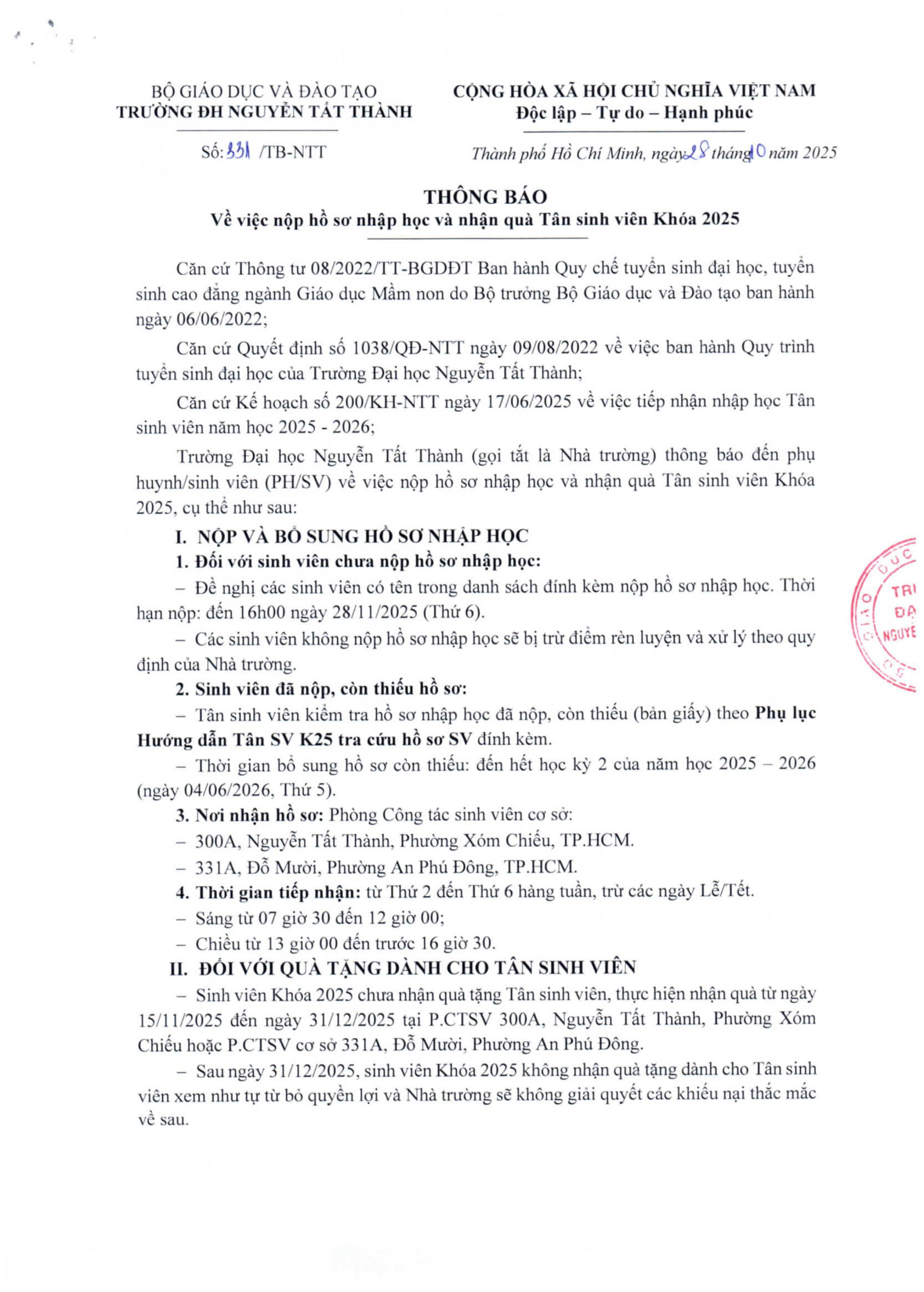 Nhà trường thông báo đến phụ huynh/sinh viên (PH/SV) về việc nộp hồ sơ nhập học và nhận quà Tân sinh viên Khóa 2025 – TSV K25, cụ thể như sau: